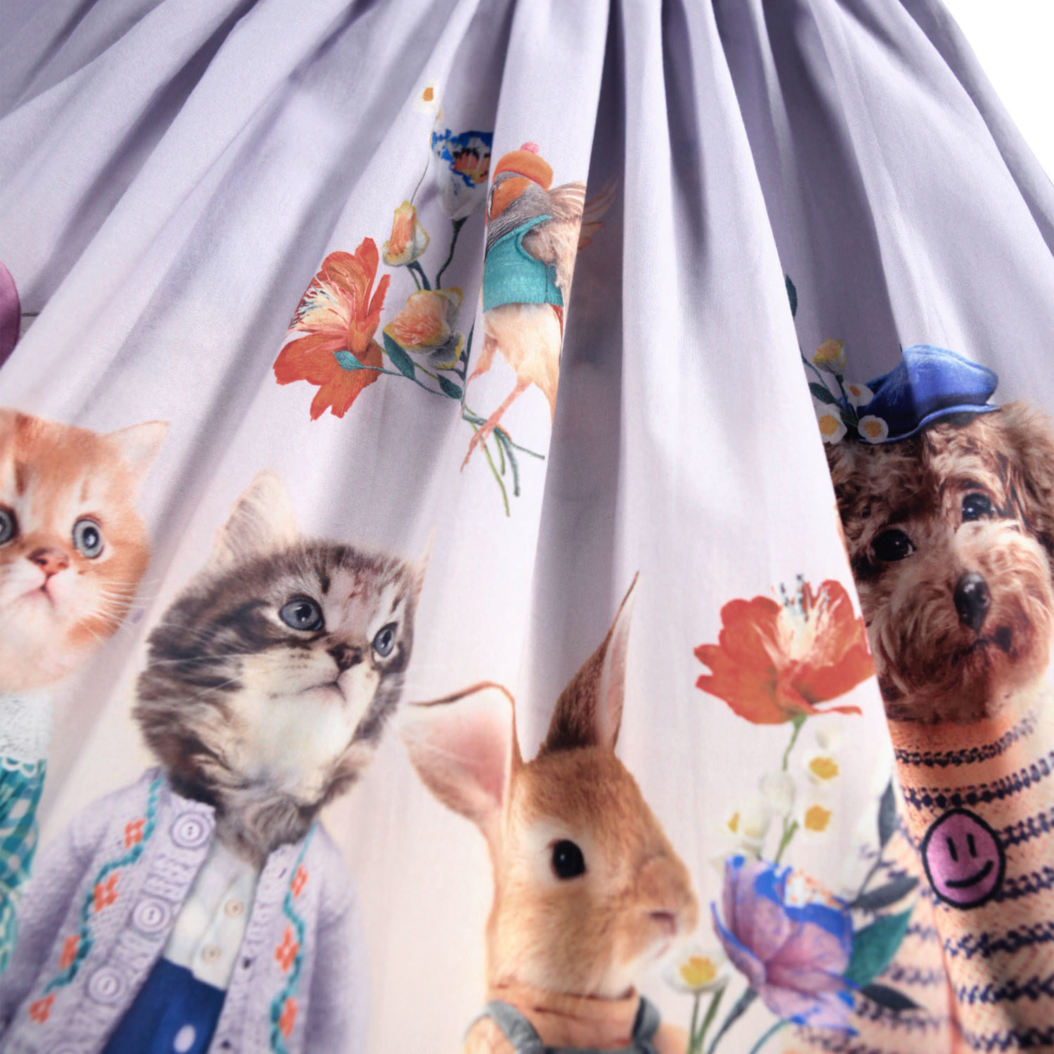 • Short-sleeved light purple dress made of organic cotton with a fitted ribbed jersey top and poplin skirt. The dress has a regular fit with a print of cuties on the skirt.