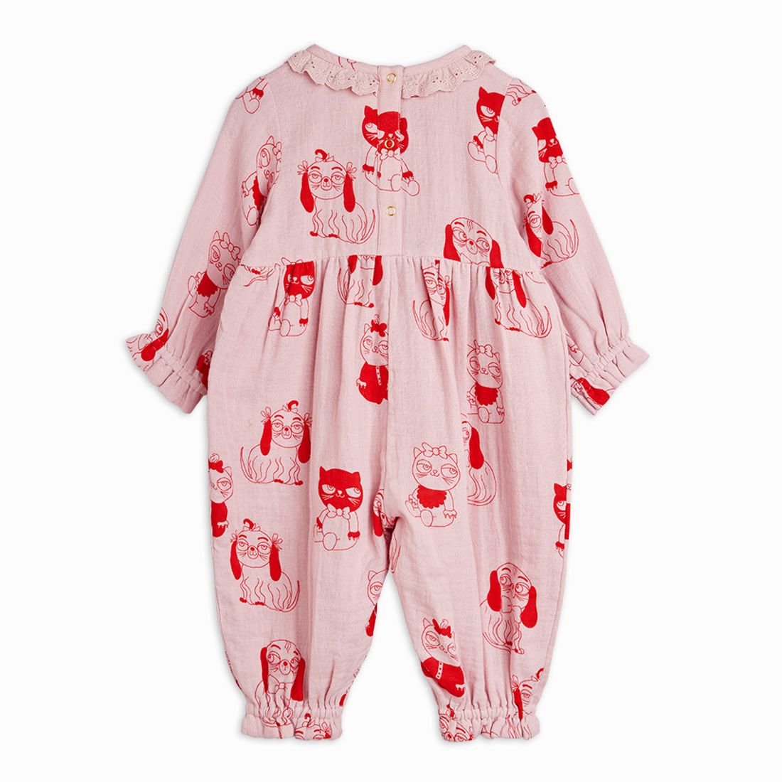 • Woven jumpsuit with All over Minibabies print. Designed with a frill collar and snap buttons in the crotch for easy dressing.