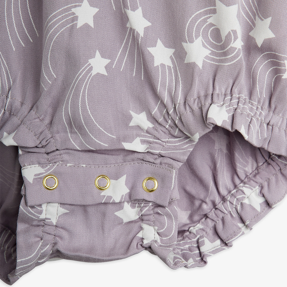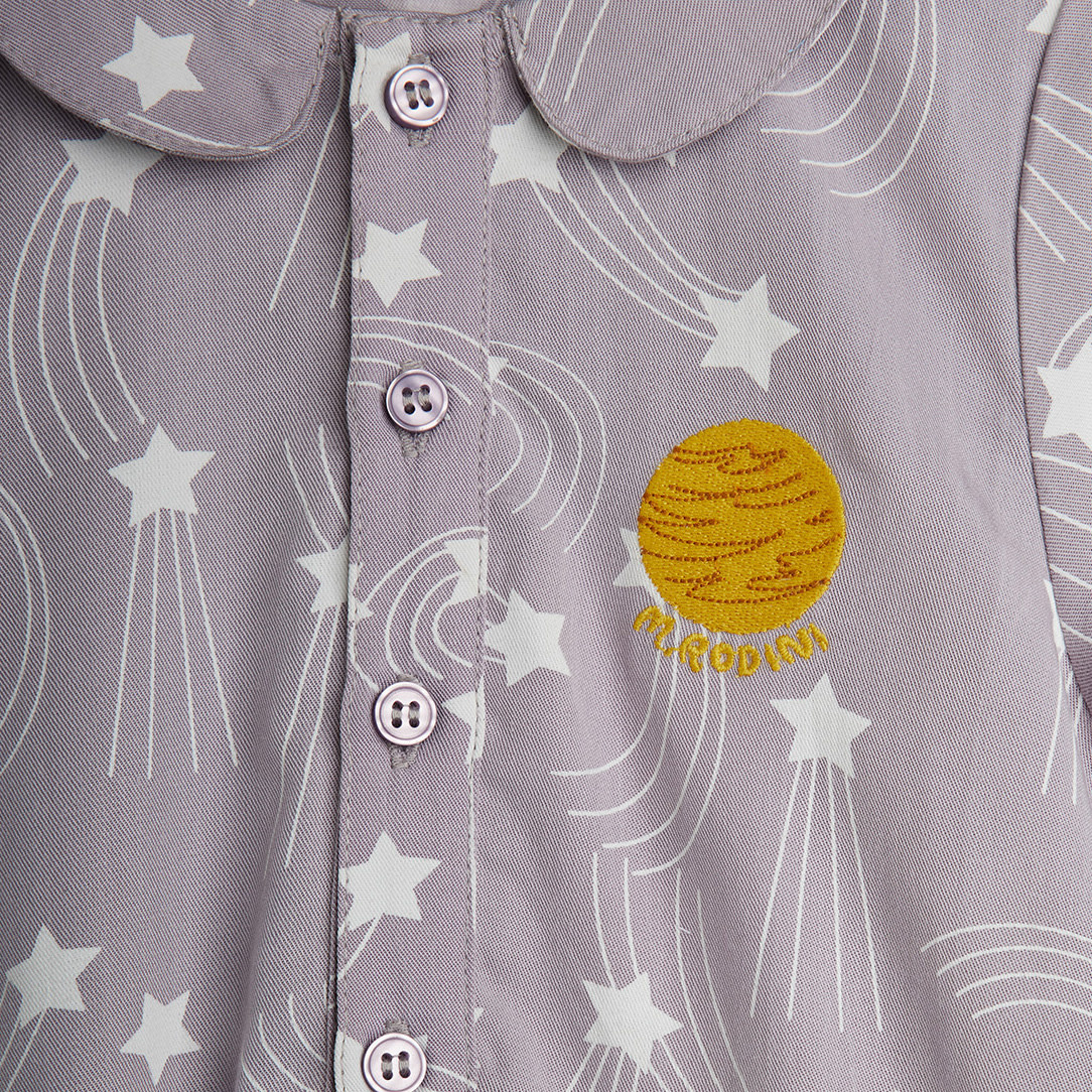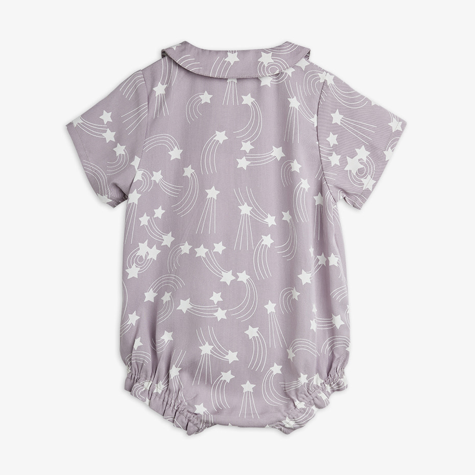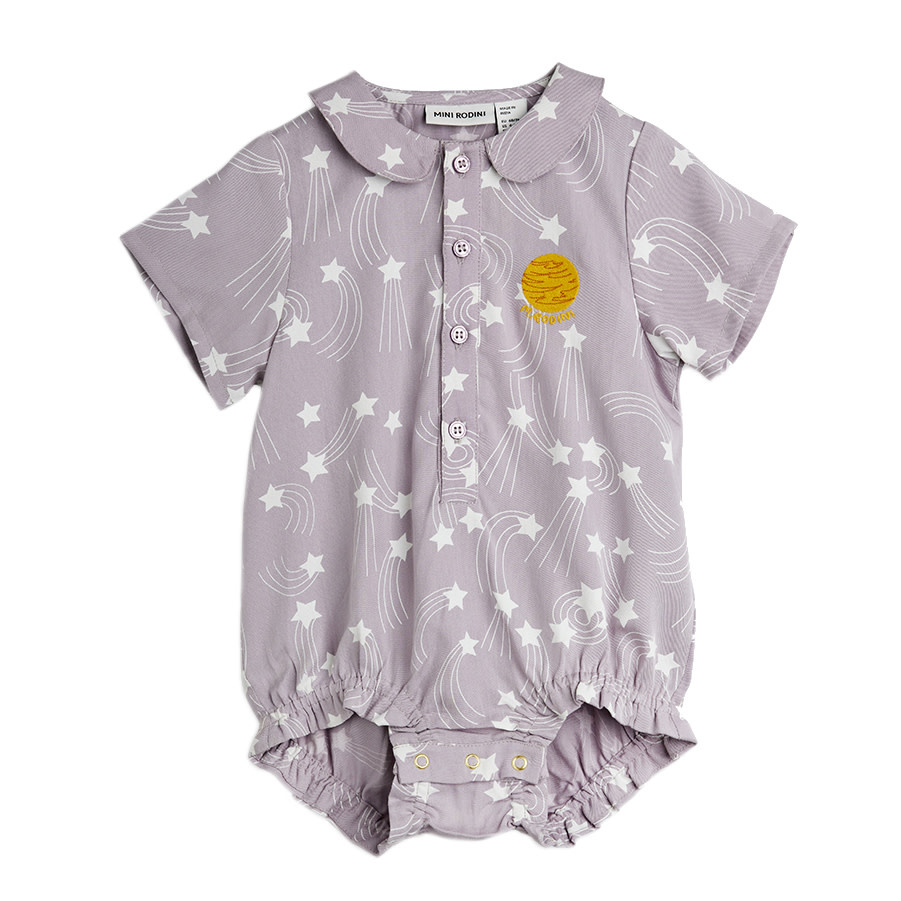 • Features the Starfall print with a small chest embroidery, Peter Pan collar and short sleeves. Buttoned front, elasticated leg openings and snap closure at the crotch for easy dressing.