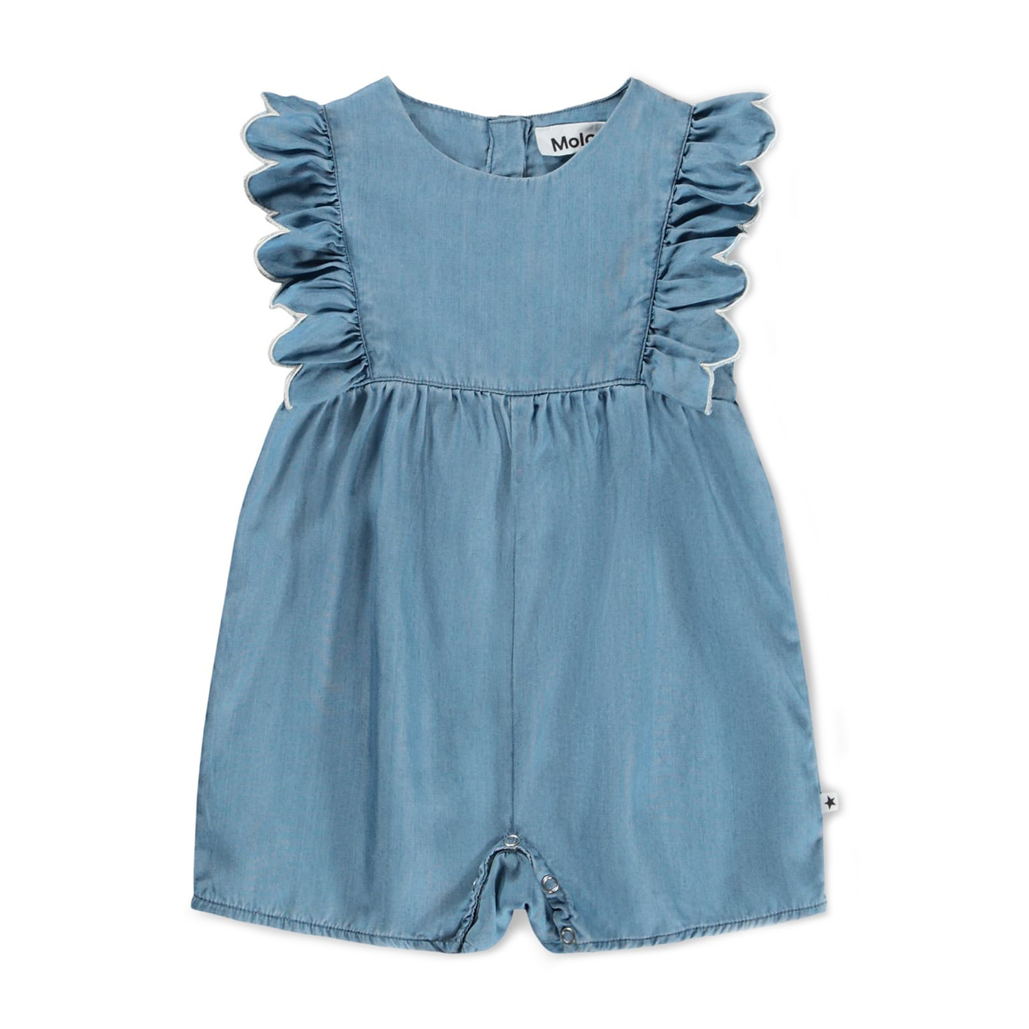 • Jumpsuit in soft organic cotton for the little ones. The jumpsuit is sleeveless and has a cute ruffled edge at the front and back. The button closure at the neck and between the legs makes it easy to get on and off.