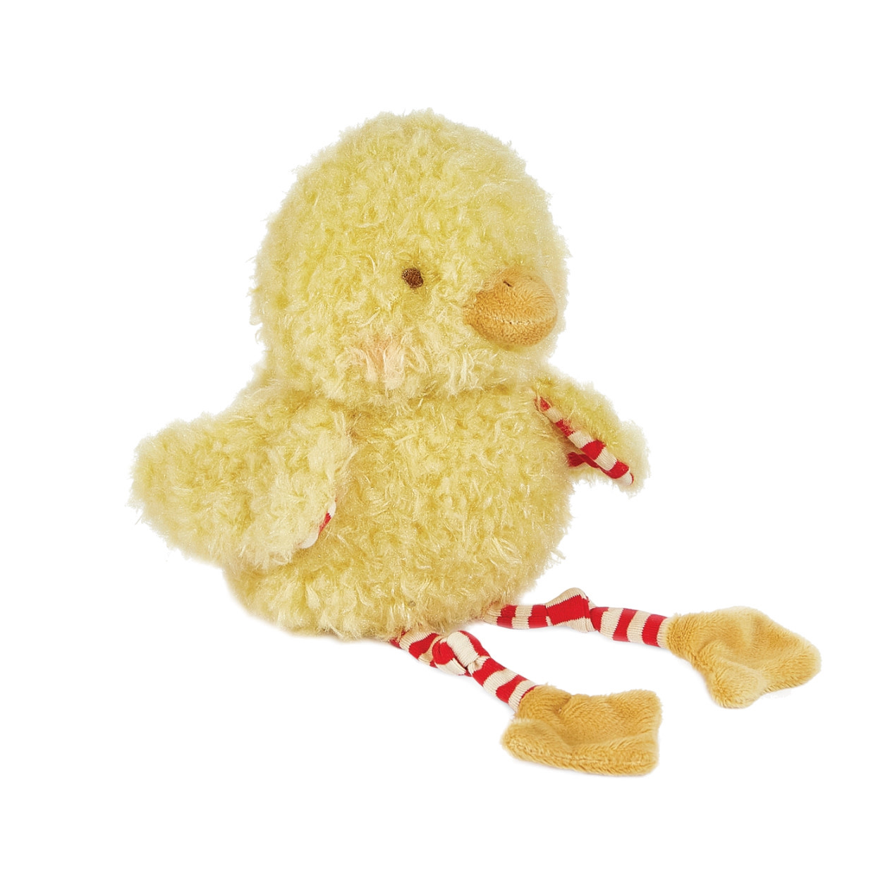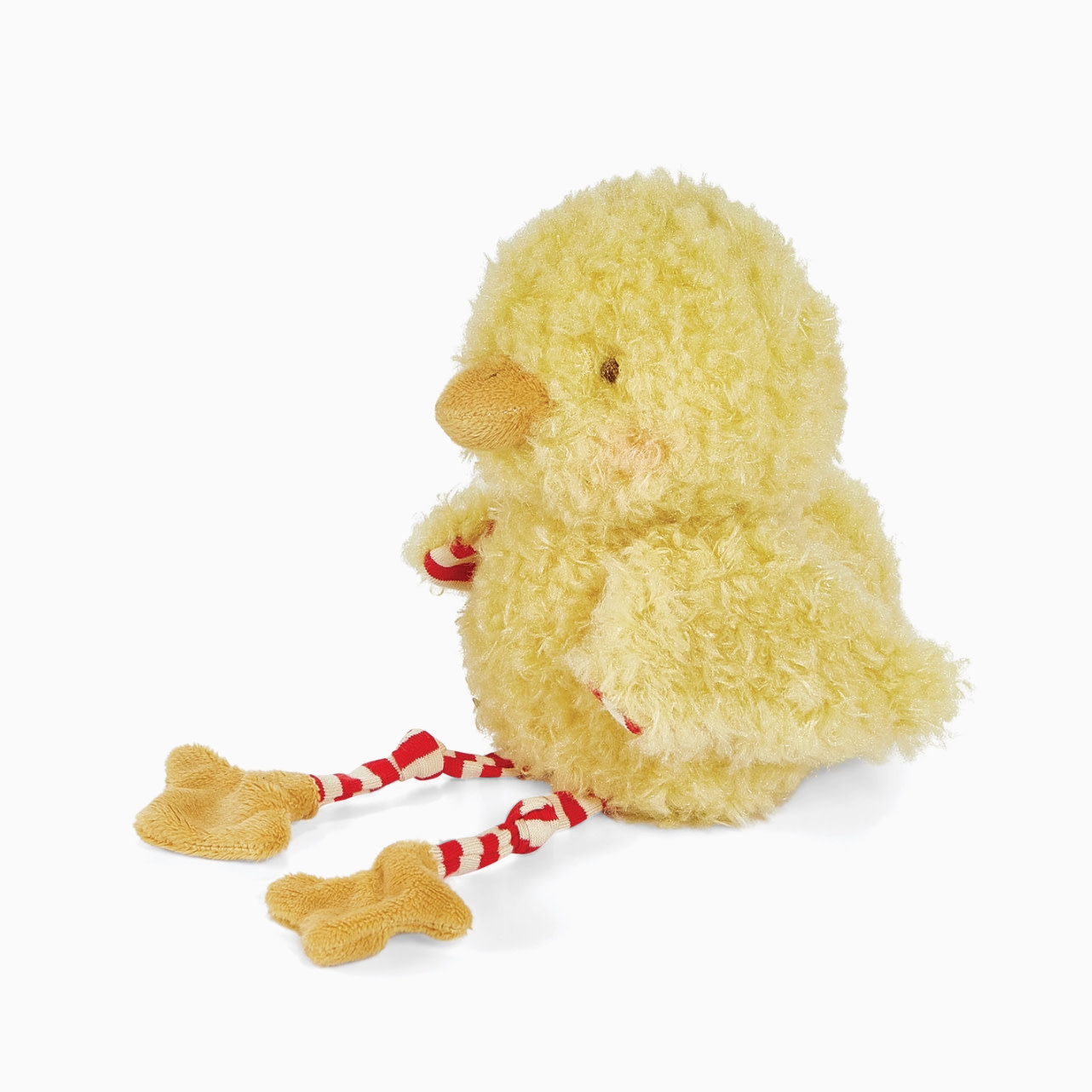 This darling chicken stuffed animal has a shaggy yellow fur body with striped, red & cream knit legs that dangle, and cute orange feet and beak for an extra pop of fun and color.