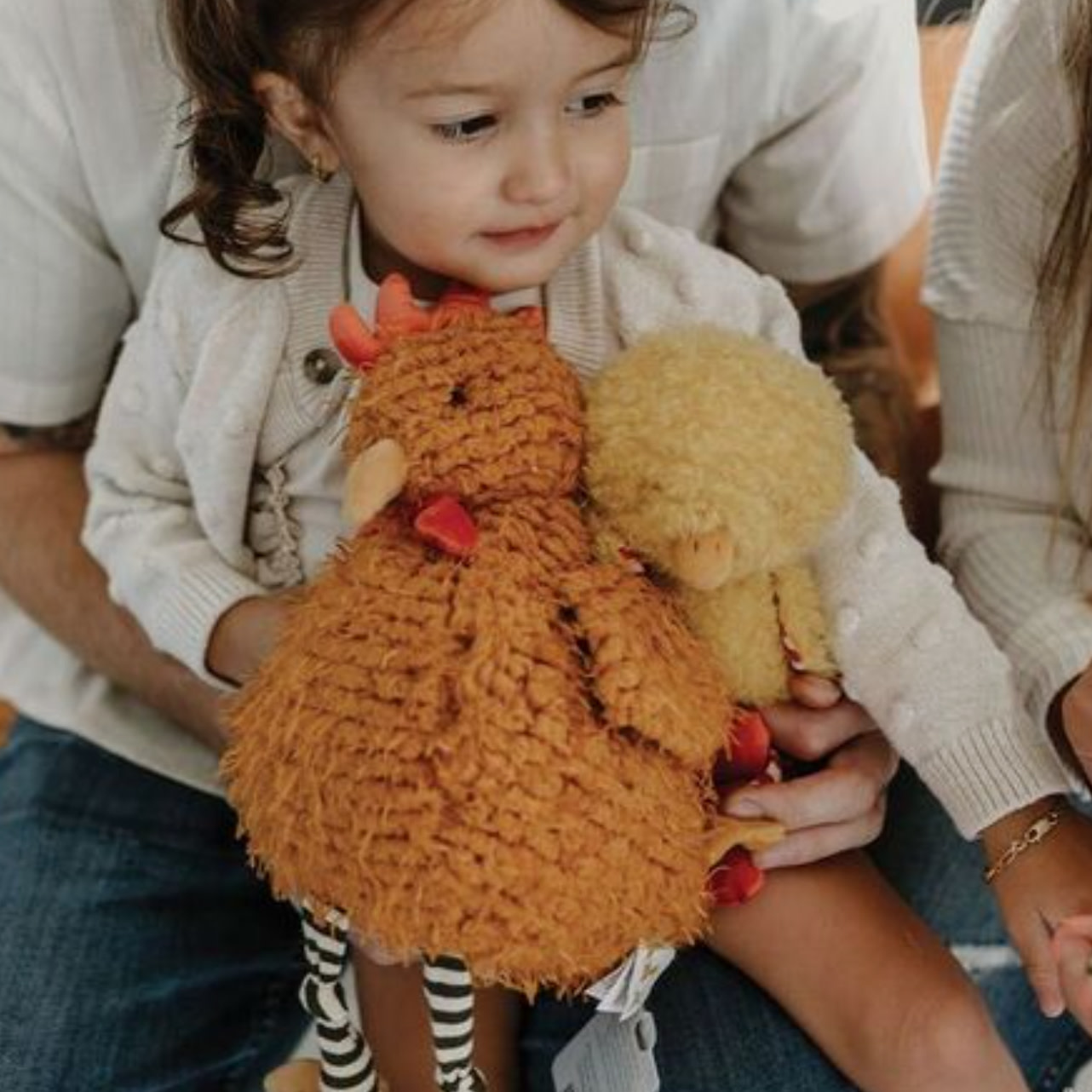 Clucky the Chicken has a shaggy cream fur body with striped red & cream knit legs that dangle, and bright orange feet and beak for an extra pop of fun and color. Clucky's hand-embroidered eyes are safe for even the littlest of farm animal friends.